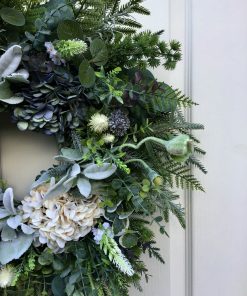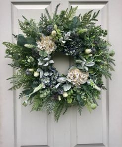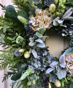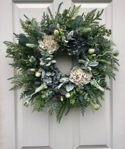 Beautiful Vintage Inspired faux Hydrangeas in a soft white & blue are the main attraction of this wreath. The greenery & foliage just compliment these beautiful blooms, the silvers & greens make it a simple but really beautiful wreath.