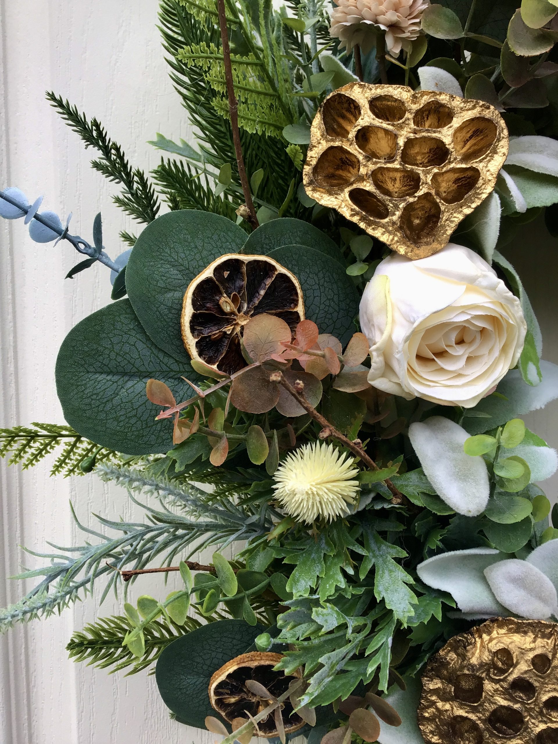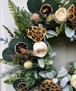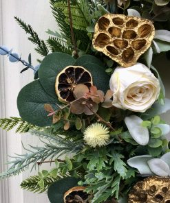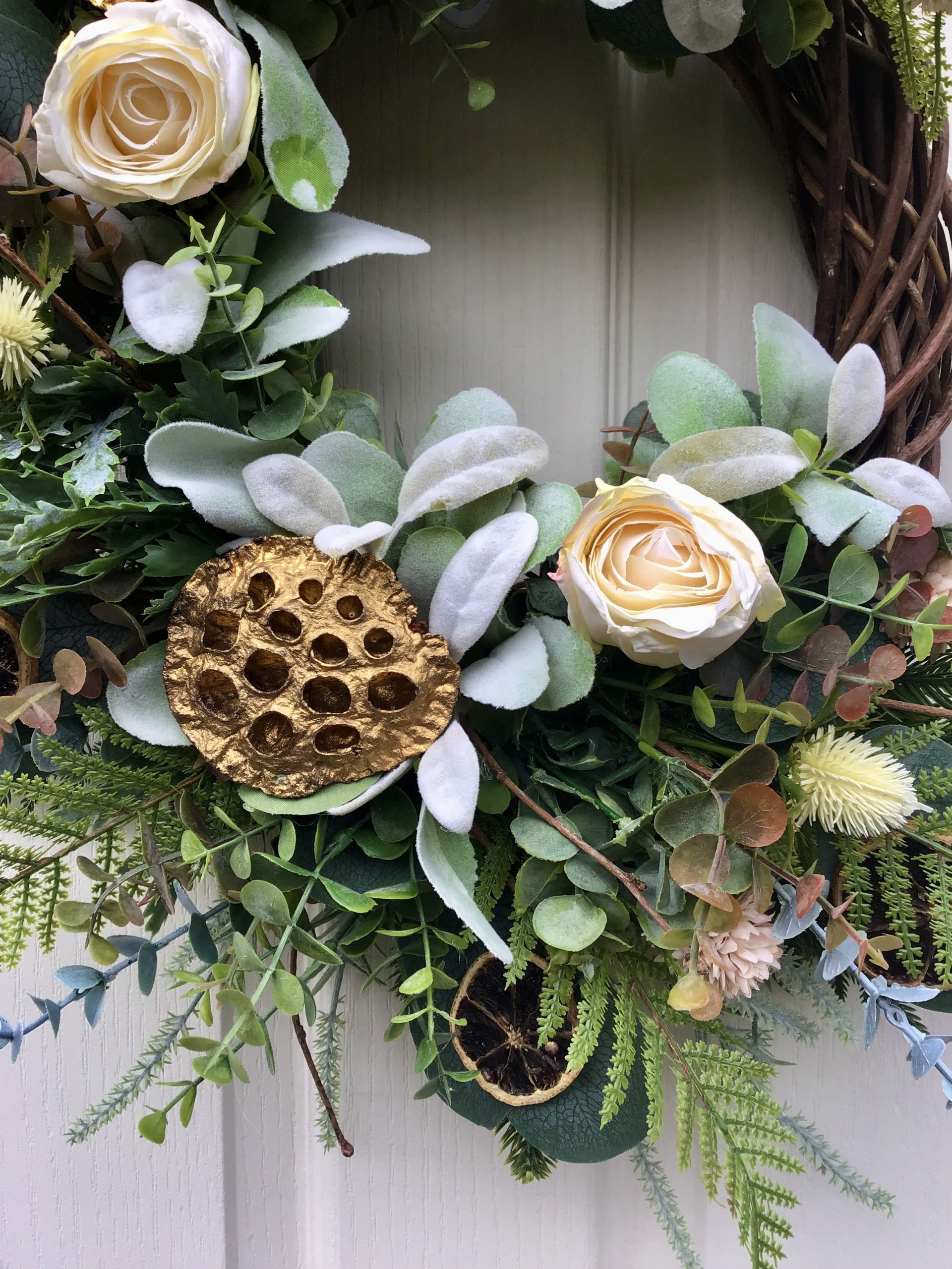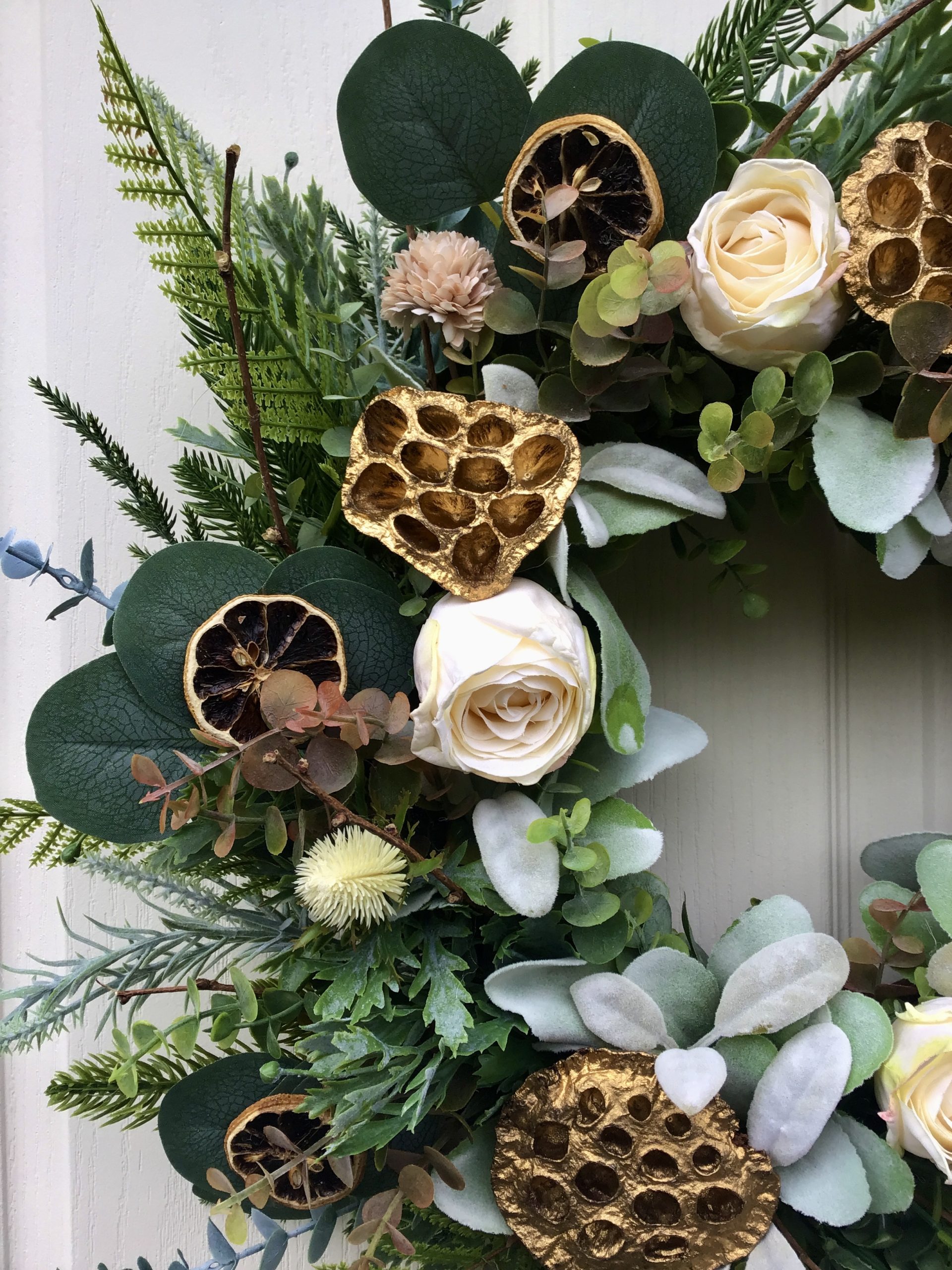 A beautiful Half Moon wreath on a woven willow base with lush winter foliage made up of mixed toned eucalyptus, ferns, pines, cypress, spruce & frosted sage stems. Decorated with soft white roses, white eryngium thistles, soft coffee coloured dandelions, dried sliced oranges & gold lotus heads to adds little sparkle to the wreath this Christmas.