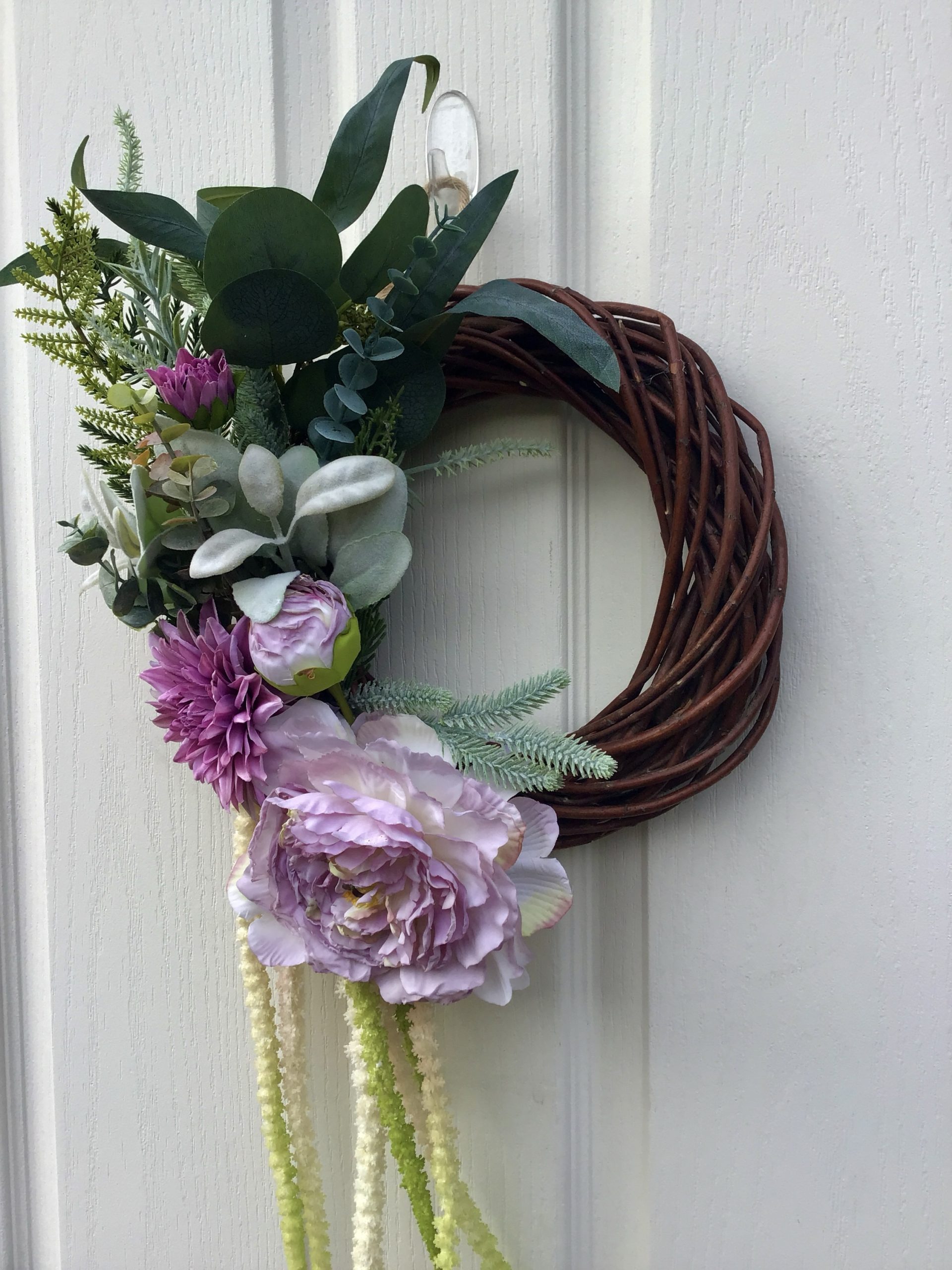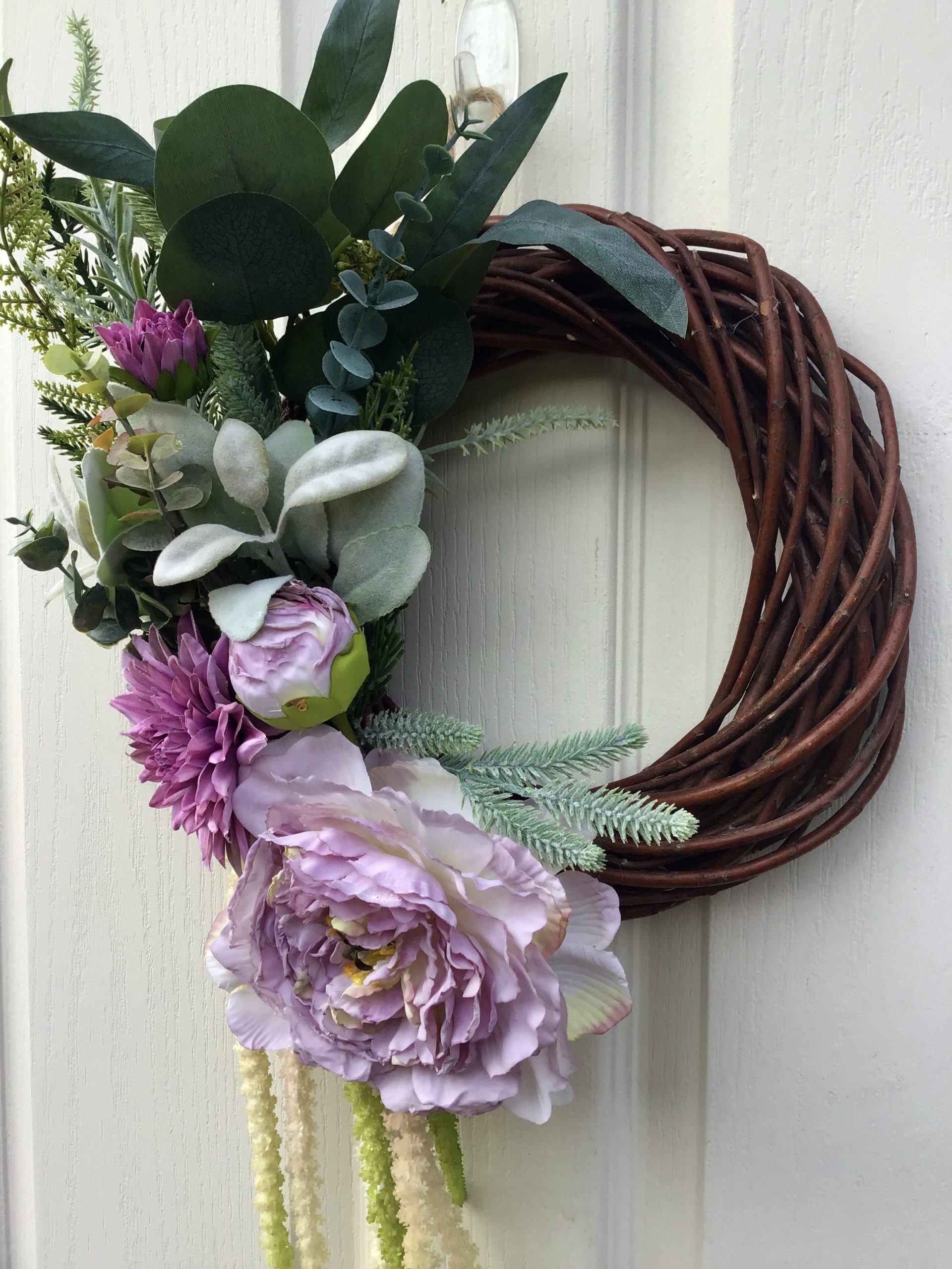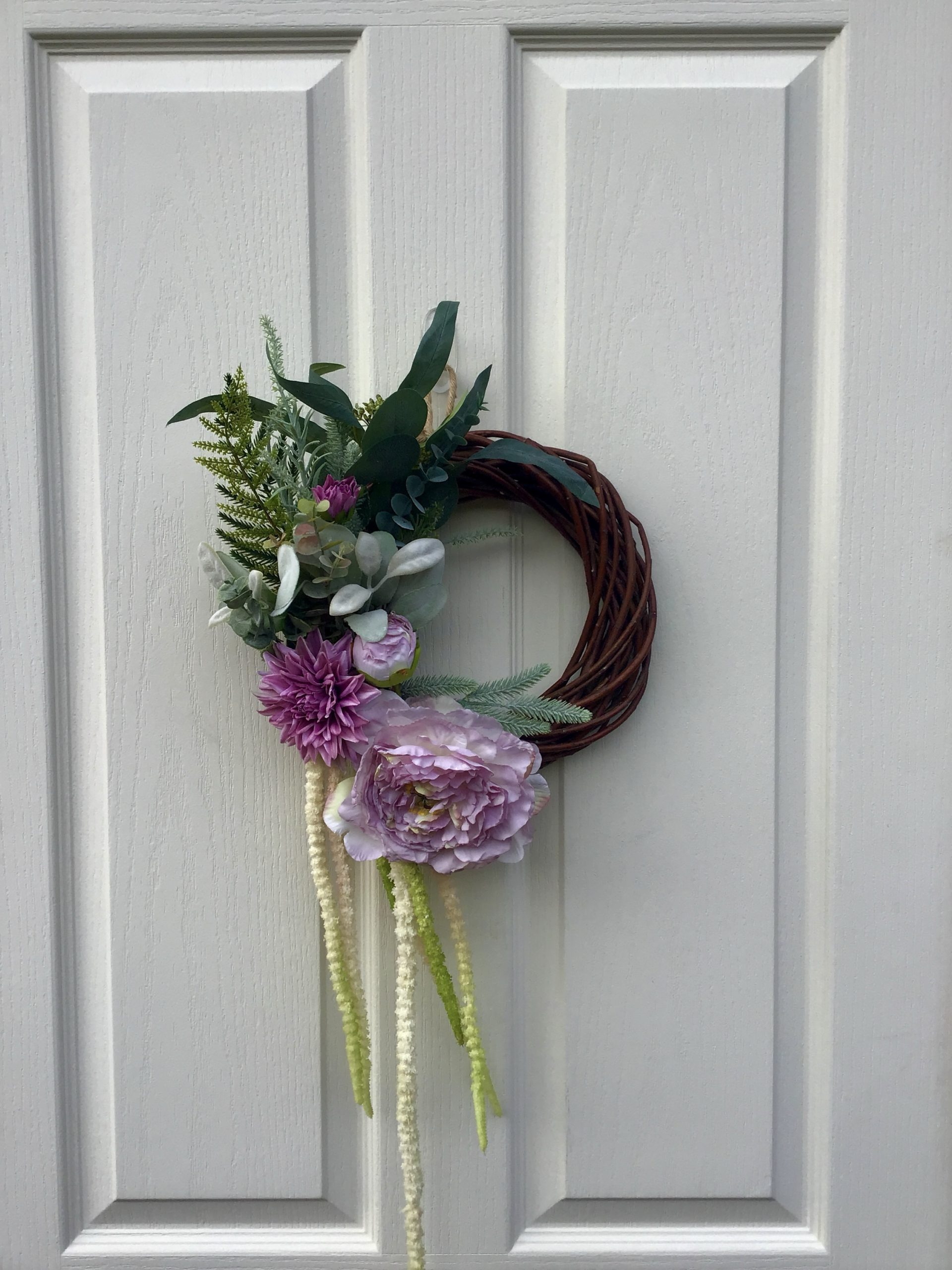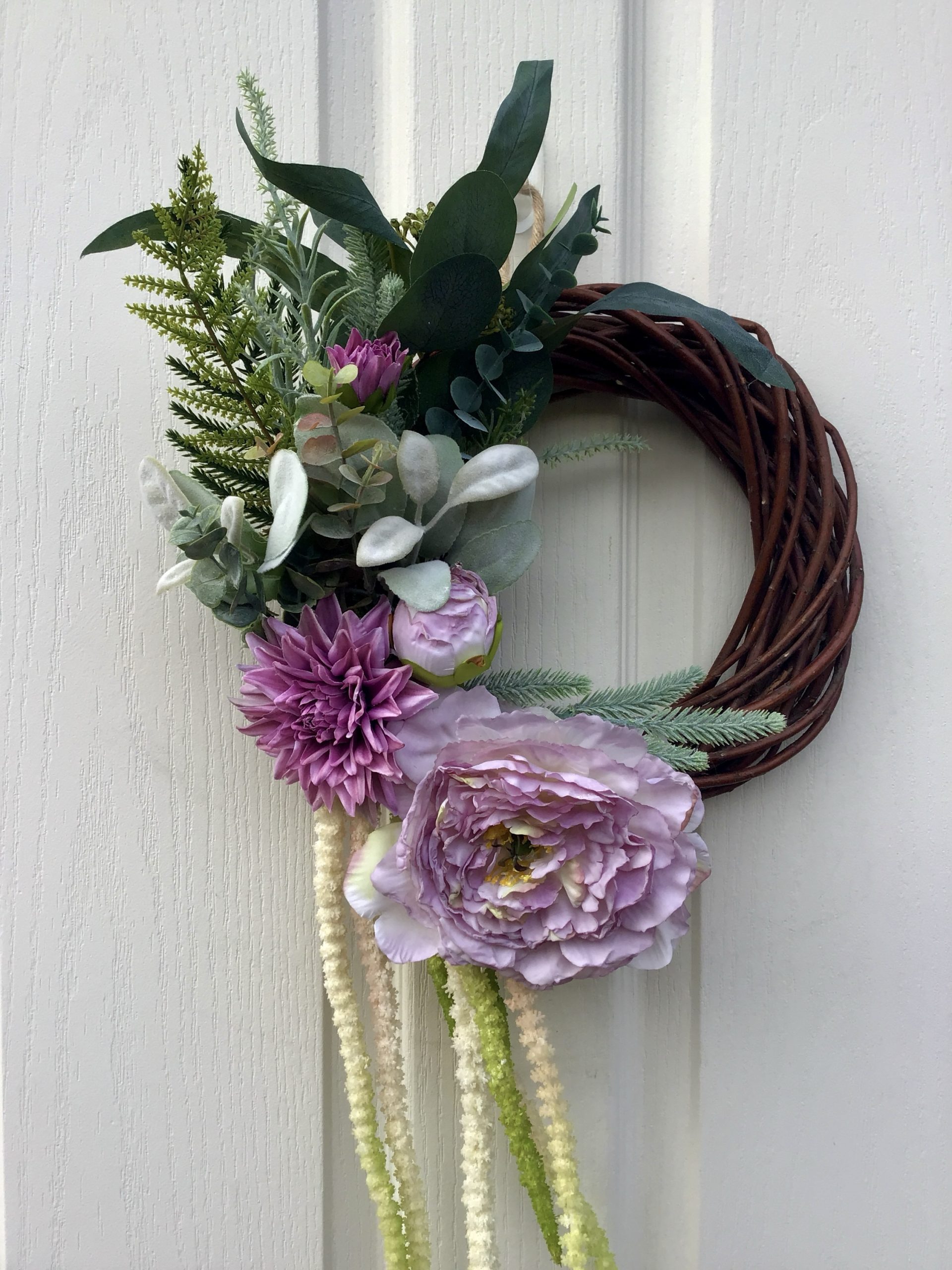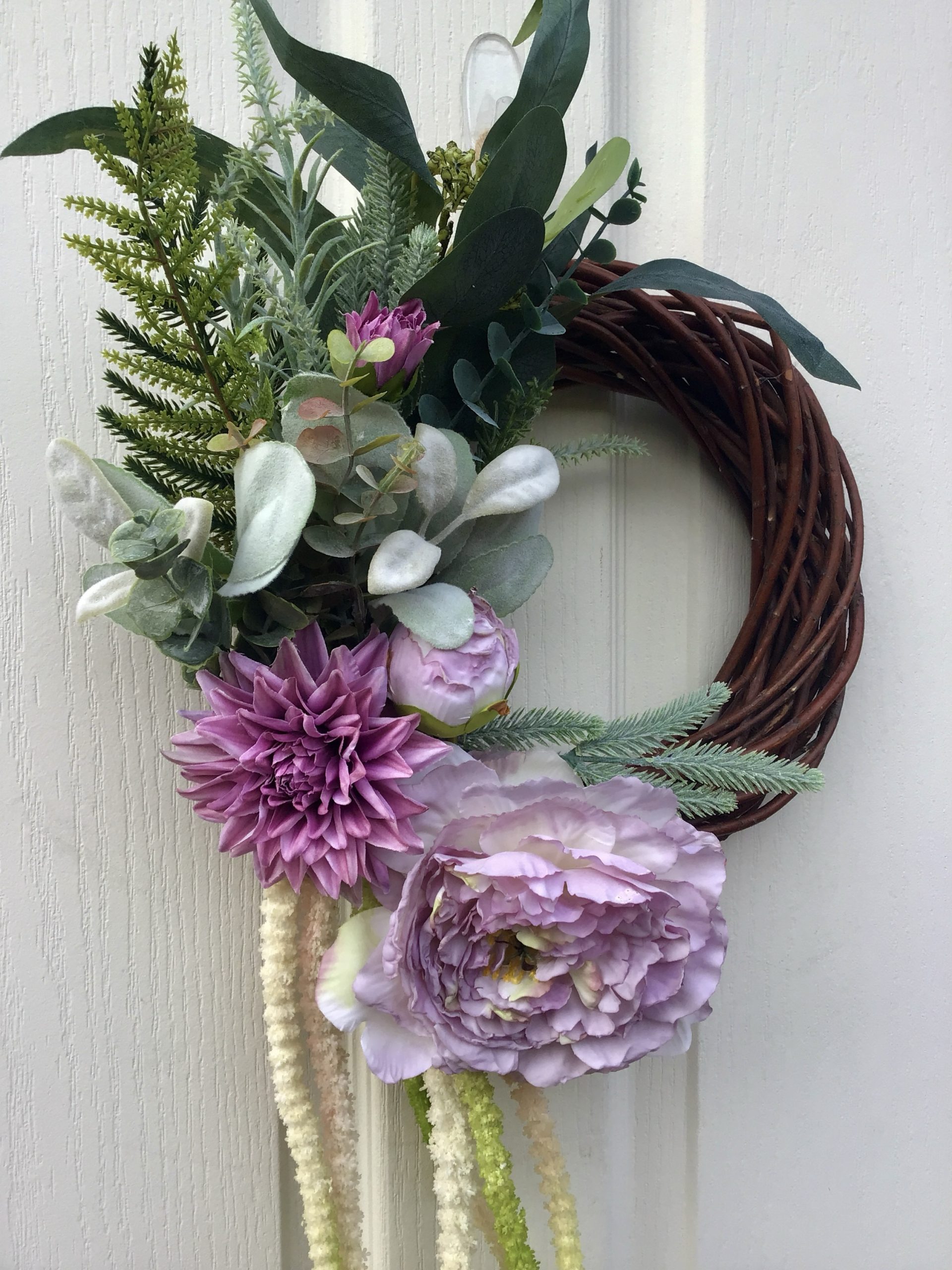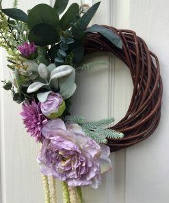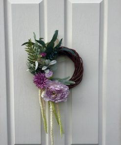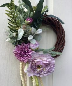 A small but beautiful wreath, a large Lilac Peony Rose, a Dahlias, all surrounded by luxury green & flocked foliage.