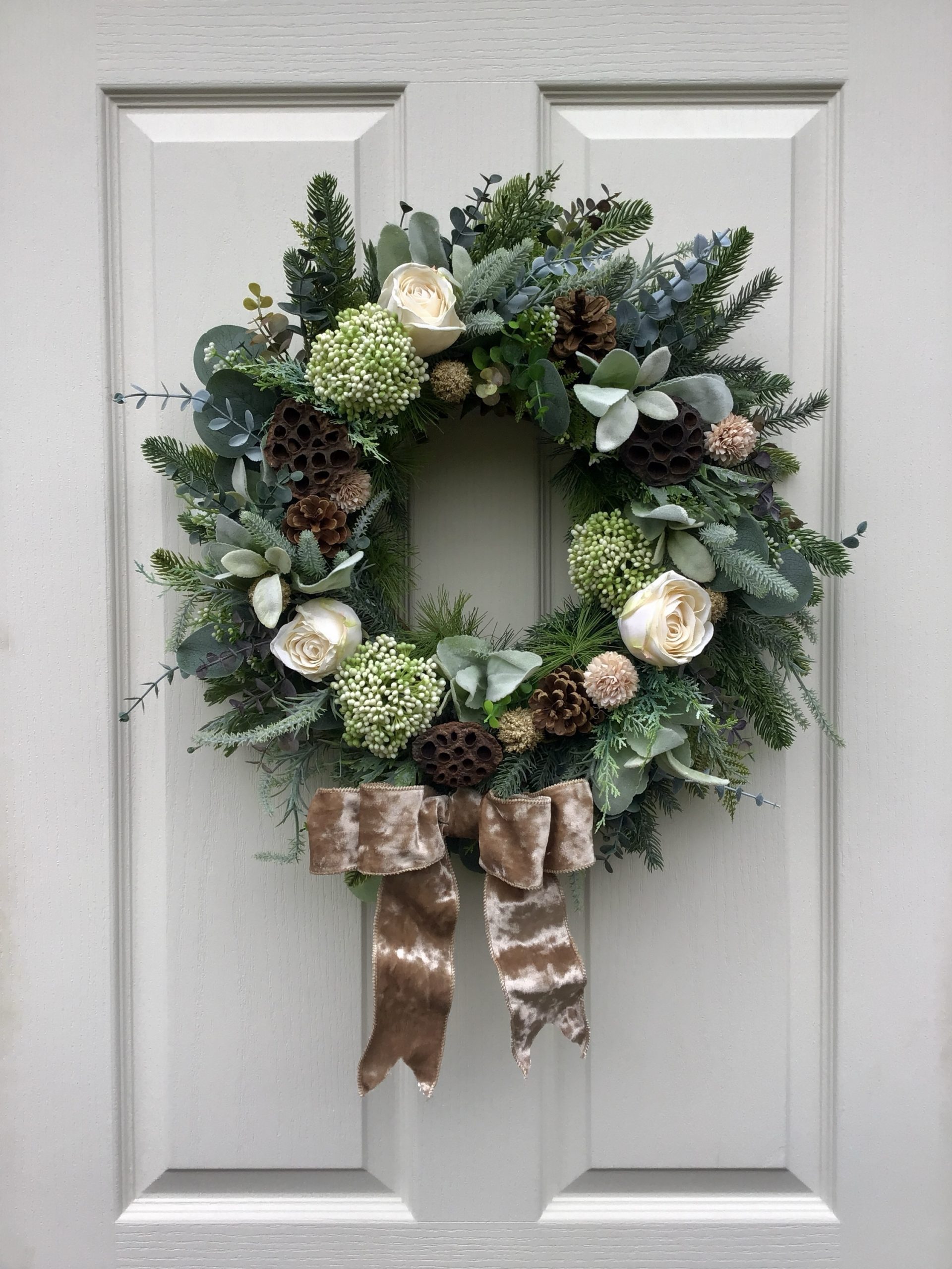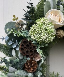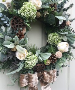 Richly coloured eucalyptus leaves, ferns, spruce, pines & flocked sage stems complement the soft white roses, oat blossoms, lotus heads & soft lambs ear beautifully. The luxurious gold velvet ribbon complements this simple but stunning wreath.